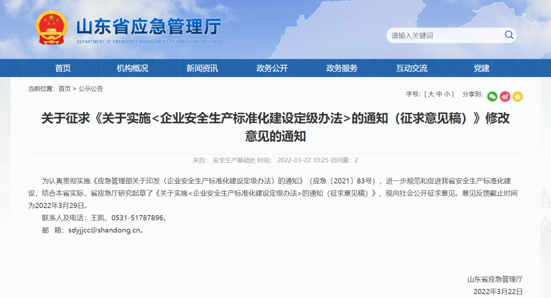 山東省應(yīng)急管理廳:關(guān)于實(shí)施<企業(yè)安全生產(chǎn)標(biāo)準(zhǔn)化建設(shè)定級(jí)辦法>的通知(征求意見(jiàn)稿)