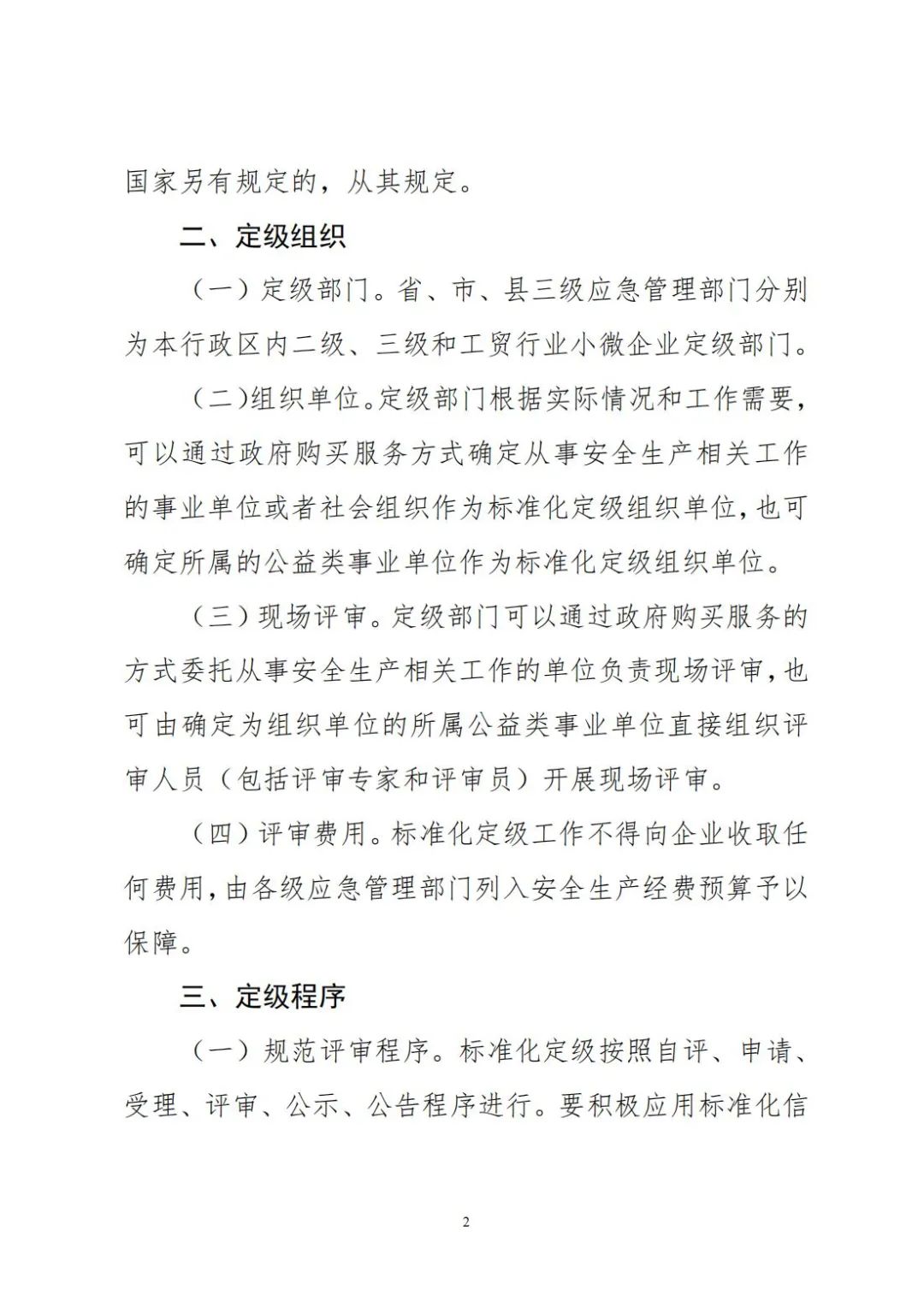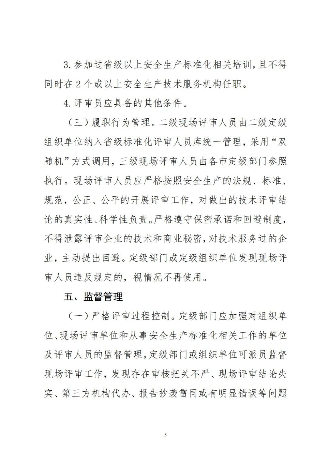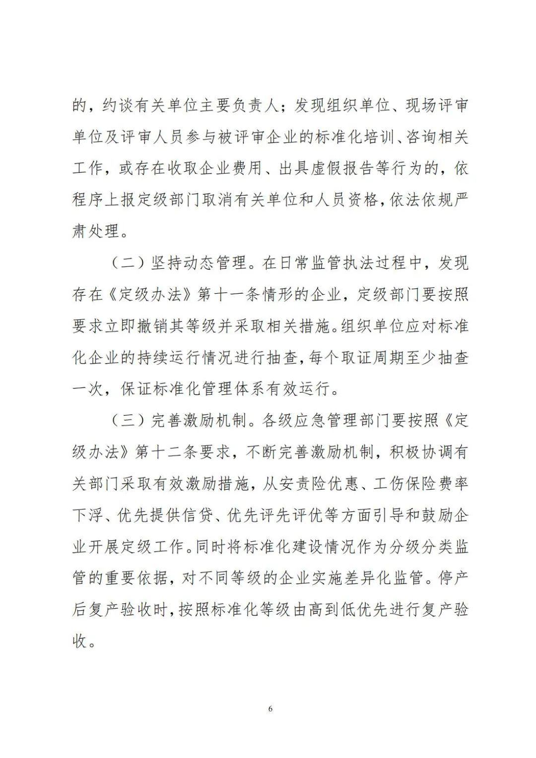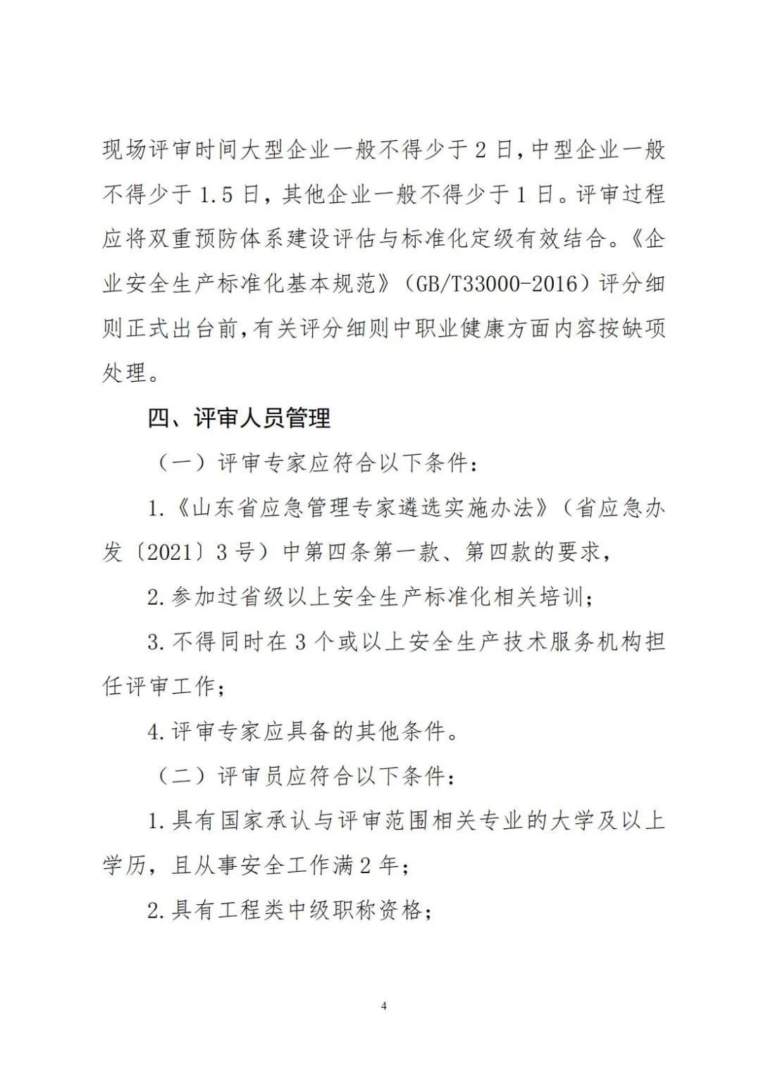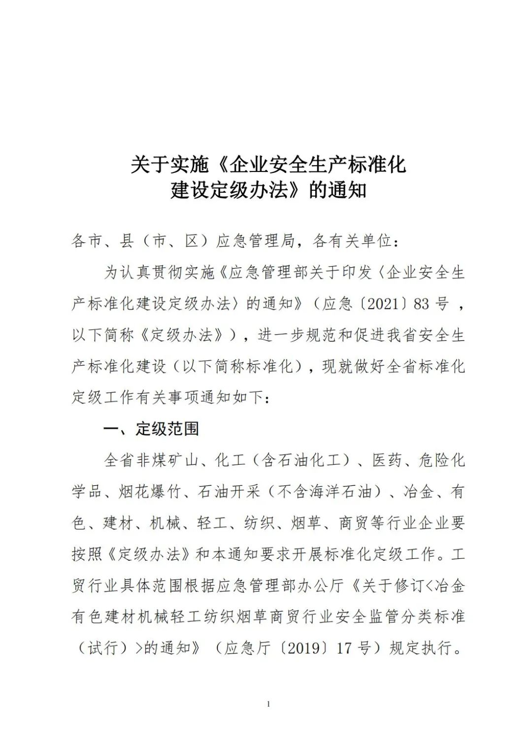 為認(rèn)真貫徹實(shí)施《應(yīng)急管理部關(guān)于印發(fā)〈企業(yè)安全生產(chǎn)標(biāo)準(zhǔn)化建設(shè)定級(jí)辦法〉的通知》(應(yīng)急〔2021〕83號(hào) ,以下簡(jiǎn)稱《定級(jí)辦法》),進(jìn)一步規(guī)范和促進(jìn)我省安全生產(chǎn)標(biāo)準(zhǔn)化建設(shè)(以下簡(jiǎn)稱標(biāo)準(zhǔn)化),現(xiàn)就做好全省標(biāo)準(zhǔn)化定級(jí)工作有關(guān)事項(xiàng)通知如下:全省非煤礦山、化工(含石油化工)、醫(yī)藥、危險(xiǎn)化學(xué)品、煙花爆竹、石油開采(不含海洋石油)、冶金、有色、建材、機(jī)械、輕工、紡織、煙草、商貿(mào)等行業(yè)企業(yè)要按照《定級(jí)辦法》和本通知要求開展標(biāo)準(zhǔn)化定級(jí)工作。工貿(mào)行業(yè)具體范圍根據(jù)應(yīng)急管理部辦公廳《關(guān)于修訂<冶金有色建材機(jī)械輕工紡織煙草商貿(mào)行業(yè)安全監(jiān)管分類標(biāo)準(zhǔn)(試行)>的通知》(應(yīng)急廳〔2019〕17號(hào))規(guī)定執(zhí)行。國(guó)家另有規(guī)定的,從其規(guī)定。(一)定級(jí)部門。省、市、縣三級(jí)應(yīng)急管理部門分別為本行政區(qū)內(nèi)二級(jí)、三級(jí)和工貿(mào)行業(yè)小微企業(yè)定級(jí)部門。(二)組織單位。定級(jí)部門根據(jù)實(shí)際情況和工作需要,可以通過(guò)政府購(gòu)買服務(wù)方式確定從事安全生產(chǎn)相關(guān)工作的事業(yè)單位或者社會(huì)組織作為標(biāo)準(zhǔn)化定級(jí)組織單位,也可確定所屬的公益類事業(yè)單位作為標(biāo)準(zhǔn)化定級(jí)組織單位。(三)現(xiàn)場(chǎng)評(píng)審。定級(jí)部門可以通過(guò)政府購(gòu)買服務(wù)的方式委托從事安全生產(chǎn)相關(guān)工作的單位負(fù)責(zé)現(xiàn)場(chǎng)評(píng)審,也可由確定為組織單位的所屬公益類事業(yè)單位直接組織評(píng)審人員(包括評(píng)審專家和評(píng)審員)開展現(xiàn)場(chǎng)評(píng)審。(四)評(píng)審費(fèi)用。標(biāo)準(zhǔn)化定級(jí)工作不得向企業(yè)收取任何費(fèi)用,由各級(jí)應(yīng)急管理部門列入安全生產(chǎn)經(jīng)費(fèi)預(yù)算予以保障。(一)規(guī)范評(píng)審程序。標(biāo)準(zhǔn)化定級(jí)按照自評(píng)、申請(qǐng)、受理、評(píng)審、公示、公告程序進(jìn)行。要積極應(yīng)用標(biāo)準(zhǔn)化信息化系統(tǒng),做到網(wǎng)上審報(bào)、受理及動(dòng)態(tài)管理,實(shí)現(xiàn)材料“無(wú)紙化”和過(guò)程“零跑腿”。(二)嚴(yán)格創(chuàng)建條件。企業(yè)應(yīng)當(dāng)自主開展標(biāo)準(zhǔn)化建設(shè),做到全員參與。企業(yè)創(chuàng)建不得委托第三方機(jī)構(gòu)包辦,創(chuàng)建初期確需技術(shù)支持的,可聘請(qǐng)安全生產(chǎn)技術(shù)服務(wù)機(jī)構(gòu)或?qū)<覟槠髽I(yè)提供咨詢和培訓(xùn)服務(wù)。企業(yè)申請(qǐng)除符合《定級(jí)辦法》第八條的共性條件外,還應(yīng)符合:申請(qǐng)二級(jí)定級(jí)的企業(yè)申請(qǐng)之日前3年內(nèi)未發(fā)生過(guò)生產(chǎn)安全死亡事故,統(tǒng)計(jì)分析事故起數(shù)、千人重傷率、傷害嚴(yán)重率等逐年下降或者持平,曾被定為三級(jí)及以上等級(jí)并有效運(yùn)行3年以上。行業(yè)領(lǐng)先的新設(shè)立企業(yè),積極開展標(biāo)準(zhǔn)化創(chuàng)建工作有效運(yùn)行3年以上,可直接申請(qǐng)二級(jí)定級(jí)。申請(qǐng)三級(jí)定級(jí)的企業(yè)申請(qǐng)之日前2年內(nèi)未發(fā)生過(guò)生產(chǎn)安全死亡事故,統(tǒng)計(jì)分析事故起數(shù)、千人重傷率、傷害嚴(yán)重率等逐年下降或者持平。(三)嚴(yán)把評(píng)審質(zhì)量,F(xiàn)場(chǎng)評(píng)審應(yīng)選擇符合專業(yè)要求的評(píng)審專家和評(píng)審員組成現(xiàn)場(chǎng)評(píng)審組,其中,二級(jí)定級(jí)現(xiàn)場(chǎng)評(píng)審專家一般不得少于5人,三級(jí)一般不得少于3人。現(xiàn)場(chǎng)評(píng)審時(shí)間大型企業(yè)一般不得少于2日,中型企業(yè)一般不得少于1.5日,其他企業(yè)一般不得少于1日。評(píng)審過(guò)程應(yīng)將雙重預(yù)防體系建設(shè)評(píng)估與標(biāo)準(zhǔn)化定級(jí)有效結(jié)合!镀髽I(yè)安全生產(chǎn)標(biāo)準(zhǔn)化基本規(guī)范》(GB/T33000-2016)評(píng)分細(xì)則正式出臺(tái)前,有關(guān)評(píng)分細(xì)則中職業(yè)健康方面內(nèi)容按缺項(xiàng)處理。(一)評(píng)審專家應(yīng)符合以下條件:1.《山東省應(yīng)急管理專家遴選實(shí)施辦法》(省應(yīng)急辦發(fā)〔2021〕3號(hào))中第四條第一款、第四款的要求,2.參加過(guò)省級(jí)以上安全生產(chǎn)標(biāo)準(zhǔn)化相關(guān)培訓(xùn);3.不得同時(shí)在3個(gè)或以上安全生產(chǎn)技術(shù)服務(wù)機(jī)構(gòu)擔(dān)任評(píng)審工作;4.評(píng)審專家應(yīng)具備的其他條件。(二)評(píng)審員應(yīng)符合以下條件:1.具有國(guó)家承認(rèn)與評(píng)審范圍相關(guān)專業(yè)的大學(xué)及以上學(xué)歷,且從事安全工作滿2年;3.參加過(guò)省級(jí)以上安全生產(chǎn)標(biāo)準(zhǔn)化相關(guān)培訓(xùn),且不得同時(shí)在2個(gè)或以上安全生產(chǎn)技術(shù)服務(wù)機(jī)構(gòu)任職。4.評(píng)審員應(yīng)具備的其他條件。(三)履職行為管理。二級(jí)現(xiàn)場(chǎng)評(píng)