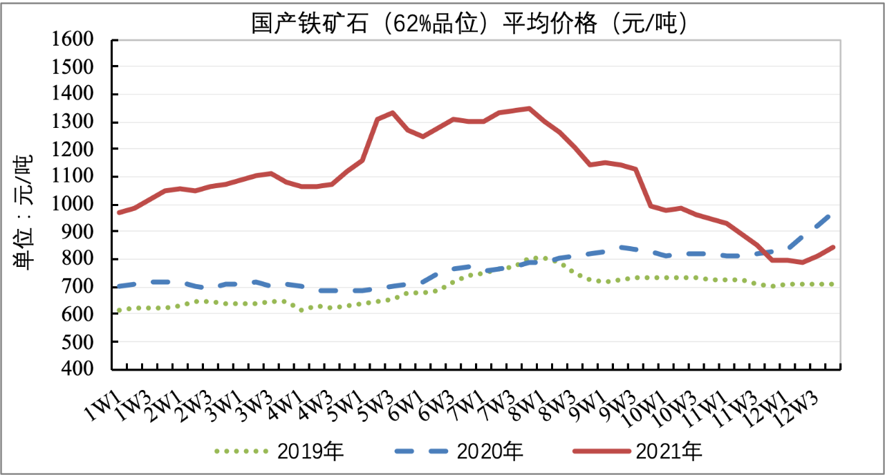 國內(nèi)礦方面,按統(tǒng)計局公布數(shù)據(jù),2021年我國累計生產(chǎn)鐵礦石原礦98052.8萬噸,折合成品礦(折62%品位)約3.05億噸,同比增加9.4%。2021年,受進口礦價格波動影響,國內(nèi)鐵礦石價格隨之大幅波動,年初價格為970元/噸,7月份快速增長至1350元/噸,之后波動下降至年底的800元/噸。
