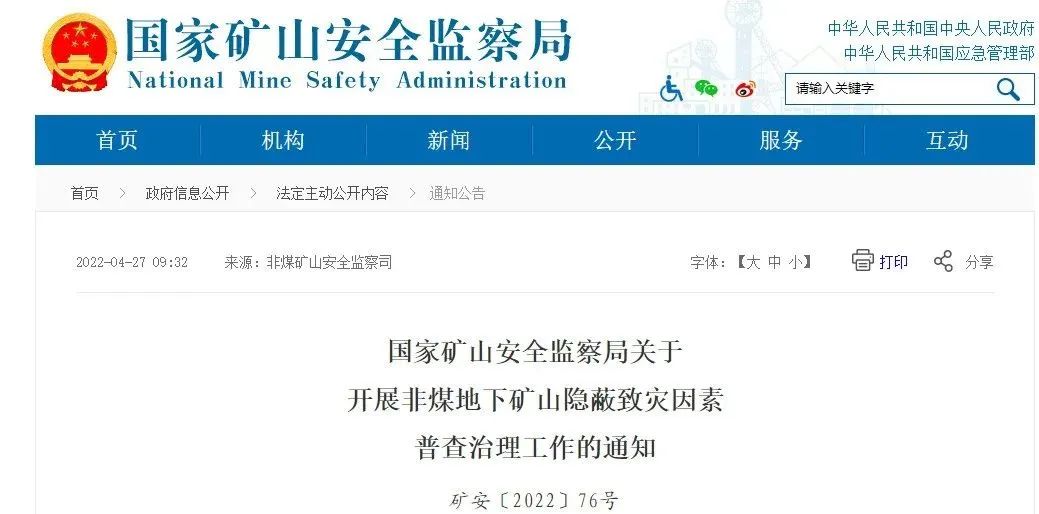 官方通知 | 《國家礦山安全監(jiān)察局關于開展非煤地下礦山隱蔽致災因素普查治理工作的通知》(礦安〔2022〕76號)