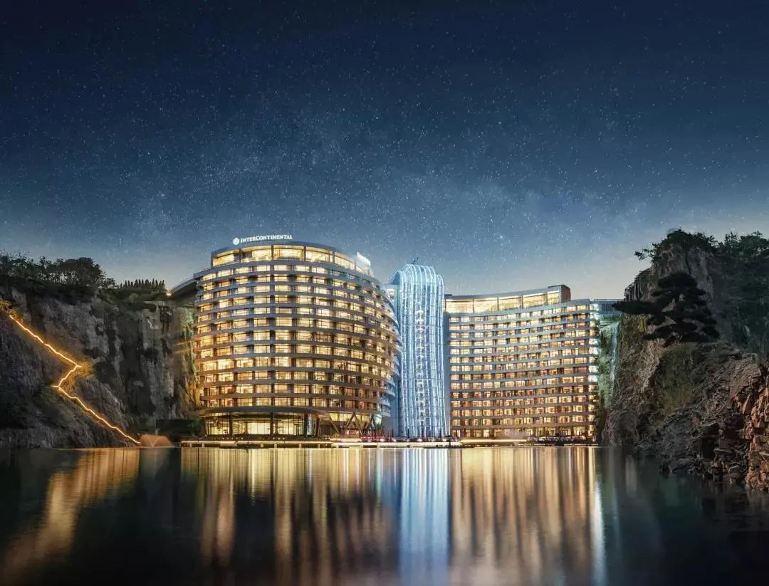 上海佘山國(guó)家公園南側(cè),有一個(gè)80多米深、約5個(gè)足球場(chǎng)大小的采石坑。這曾是一個(gè)歷史難題,但現(xiàn)在,目前世界上海拔最低的豪華酒店在這個(gè)深坑里橫空出世。