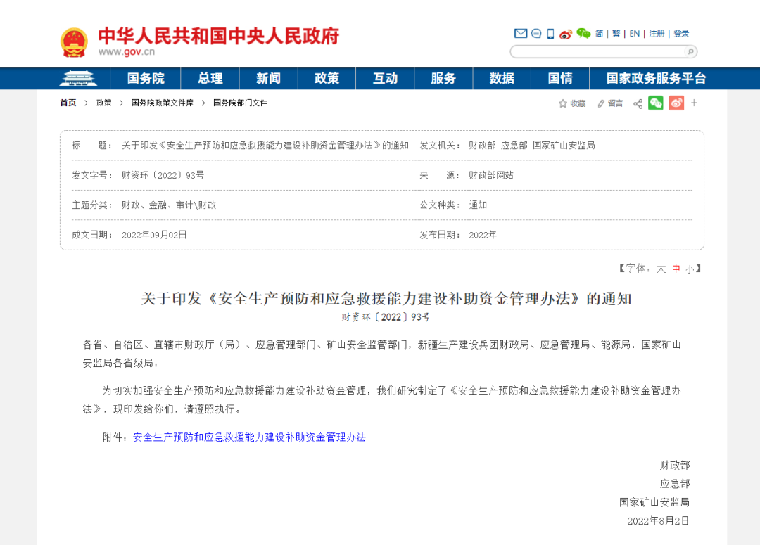 財(cái)政部、應(yīng)急部和國家礦山安監(jiān)局近日印發(fā)《安全生產(chǎn)預(yù)防和應(yīng)急救援能力建設(shè)補(bǔ)助資金管理辦法》(以下簡稱《辦法》),明確安全生產(chǎn)補(bǔ)助資金重點(diǎn)支持范圍、預(yù)算管理與監(jiān)督等內(nèi)容。