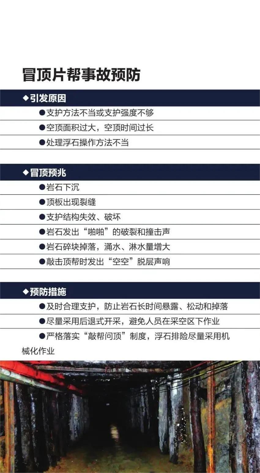 4、漏頂:放炮前把頂板打爛,不及時處理或支架不牢,會使棚頂拖空,支架松動,頂板渣石繼續(xù)冒落,就會造成沒有響聲的大冒頂。