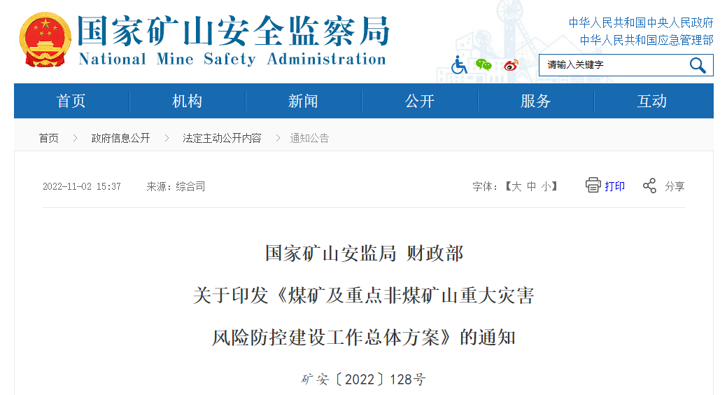 各省、自治區(qū)、直轄市及新疆生產(chǎn)建設(shè)兵團(tuán)礦山安全監(jiān)管部門、財(cái)政廳(局),國家礦山安監(jiān)局各省級局:為切實(shí)加強(qiáng)煤礦及重點(diǎn)非煤礦山重大災(zāi)害風(fēng)險(xiǎn)防控工作,根據(jù)《財(cái)政部 應(yīng)急部 國家礦山安監(jiān)局關(guān)于印發(fā)<安全生產(chǎn)預(yù)防和應(yīng)急救援能力建設(shè)補(bǔ)助資金管理辦法>的通知》(財(cái)資環(huán)﹝2022﹞93號),國家礦山安監(jiān)局、財(cái)政部研究制定了《煤礦及重點(diǎn)非煤礦山重大災(zāi)害風(fēng)險(xiǎn)防控建設(shè)工作總體方案》,現(xiàn)印發(fā)給你們,請認(rèn)真組織實(shí)施。附件:煤礦及重點(diǎn)非煤礦山重大災(zāi)害風(fēng)險(xiǎn)防控建設(shè)工作總體方案煤礦及重點(diǎn)非煤礦山重大災(zāi)害風(fēng)險(xiǎn)防控建設(shè)工作總體方案為貫徹落實(shí)《中共中央 國務(wù)院關(guān)于推進(jìn)安全生產(chǎn)領(lǐng)域改革發(fā)展的意見》、《“十四五”礦山安全生產(chǎn)規(guī)劃》(應(yīng)急〔2022〕64號)、《國務(wù)院安委會辦公室關(guān)于加強(qiáng)礦山安全生產(chǎn)工作的緊急通知》(安委辦〔2021〕3號)等有關(guān)工作部署,加強(qiáng)煤礦及重點(diǎn)非煤礦山重大災(zāi)害風(fēng)險(xiǎn)防控項(xiàng)目建設(shè),依據(jù)《安全生產(chǎn)預(yù)防和應(yīng)急救援能力建設(shè)補(bǔ)助資金管理辦法》(財(cái)資環(huán)〔2022〕93號),制定本方案。(一)指導(dǎo)思想。以習(xí)近平新時(shí)代中國特色社會主義思想為指導(dǎo),全面貫徹黨的二十大精神,深入貫徹落實(shí)習(xí)近平總書記關(guān)于安全生產(chǎn)重要指示批示精神,以遏制礦山重特大事故為目標(biāo),以防范化解重大安全風(fēng)險(xiǎn)為主線,充分利用新一代信息技術(shù),實(shí)現(xiàn)煤礦及重點(diǎn)非煤礦山關(guān)鍵地點(diǎn)、重點(diǎn)部位重大安全風(fēng)險(xiǎn)的實(shí)時(shí)識別、監(jiān)測和精準(zhǔn)研判,推動礦山安全監(jiān)管監(jiān)察模式向遠(yuǎn)程化、智能化、可視化以及“互聯(lián)網(wǎng)+監(jiān)管”方式轉(zhuǎn)變,提高礦山安全監(jiān)管監(jiān)察執(zhí)法效能,不斷提升礦山數(shù)字化、智能化安全生產(chǎn)水平。(二)基本原則。煤礦及重點(diǎn)非煤礦山重大災(zāi)害風(fēng)險(xiǎn)防控項(xiàng)目按照“統(tǒng)籌組織、分級負(fù)責(zé)、分步實(shí)施、有序推進(jìn)、資源整合、注重實(shí)效”的原則組織實(shí)施。——統(tǒng)籌組織、分級負(fù)責(zé)。國家礦山安監(jiān)局與財(cái)政部統(tǒng)籌謀劃推進(jìn)項(xiàng)目實(shí)施。各級礦山安全監(jiān)管監(jiān)察部門各負(fù)其責(zé)、各司其職、上下聯(lián)動、信息共享,合力推動項(xiàng)目穩(wěn)步實(shí)施。——分步實(shí)施、有序推進(jìn)。結(jié)合煤礦、非煤礦山安全發(fā)展現(xiàn)狀,按照“急用先行、突出重點(diǎn)”的原則,力爭用5年左右時(shí)間分類、分步實(shí)施,推進(jìn)地方政府建設(shè)完善礦山安全監(jiān)管監(jiān)察信息系統(tǒng),納入國家礦山安全生產(chǎn)風(fēng)險(xiǎn)監(jiān)測預(yù)警平臺,提升風(fēng)險(xiǎn)防控能力,有效防范遏制礦山重特大事故。——資源整合、注重實(shí)效。充分依托礦山安全監(jiān)管監(jiān)察能力建設(shè)現(xiàn)有成果,在國家礦山安全生產(chǎn)風(fēng)險(xiǎn)監(jiān)測預(yù)警平臺基礎(chǔ)上,擴(kuò)大聯(lián)網(wǎng)范圍和數(shù)據(jù)類別,提升對煤礦及重點(diǎn)非煤礦山關(guān)鍵場所、重點(diǎn)部位的監(jiān)測監(jiān)控水平,織密礦山重大災(zāi)害風(fēng)險(xiǎn)防控“一張網(wǎng)”。(三)工作目標(biāo)。通過建設(shè)AI視頻智能輔助監(jiān)管監(jiān)察系統(tǒng)、應(yīng)急處置視頻智能通訊系統(tǒng)和重大違法行為智能識別分析系統(tǒng),充分發(fā)揮AI智能識別、井下精準(zhǔn)定位、物聯(lián)網(wǎng)、大數(shù)據(jù)等新技術(shù)在礦山重大災(zāi)害風(fēng)險(xiǎn)識別、應(yīng)急救援等工作中的優(yōu)勢作用,依托“十三五”期間已建成的國家礦山安全生產(chǎn)風(fēng)險(xiǎn)監(jiān)測預(yù)警平臺,實(shí)現(xiàn)對煤礦及重點(diǎn)非煤礦山關(guān)鍵地點(diǎn)、重點(diǎn)部位重大風(fēng)險(xiǎn)的實(shí)時(shí)監(jiān)測、及時(shí)識別和精準(zhǔn)研判,創(chuàng)新礦山安全生產(chǎn)監(jiān)管監(jiān)察方式,積極探索形成“互聯(lián)網(wǎng)+監(jiān)管監(jiān)察”等新模式,推動提升礦山重大災(zāi)害風(fēng)險(xiǎn)防控能力,夯實(shí)礦山安全基礎(chǔ)。按照“急用先行、突出重點(diǎn)”的原則,力爭到2026年,在全國范圍內(nèi)完成所有在冊煤礦、2400座重點(diǎn)非煤礦山重大災(zāi)害風(fēng)險(xiǎn)防控項(xiàng)目建設(shè)工作。重點(diǎn)支持地方政府建設(shè)納入全國性系統(tǒng)的AI視頻智能輔助監(jiān)管監(jiān)察系統(tǒng)、應(yīng)急處置視頻智能通訊系統(tǒng)和重大違法行為智能識別分析系統(tǒng)(包括建設(shè)智慧監(jiān)管監(jiān)察平臺、安裝礦端監(jiān)測監(jiān)控設(shè)備和軟件、開展煤礦及重點(diǎn)非煤礦山重大安全風(fēng)險(xiǎn)隱患排查整治等),以及黨中央、國務(wù)院部署的加強(qiáng)礦山安全監(jiān)管