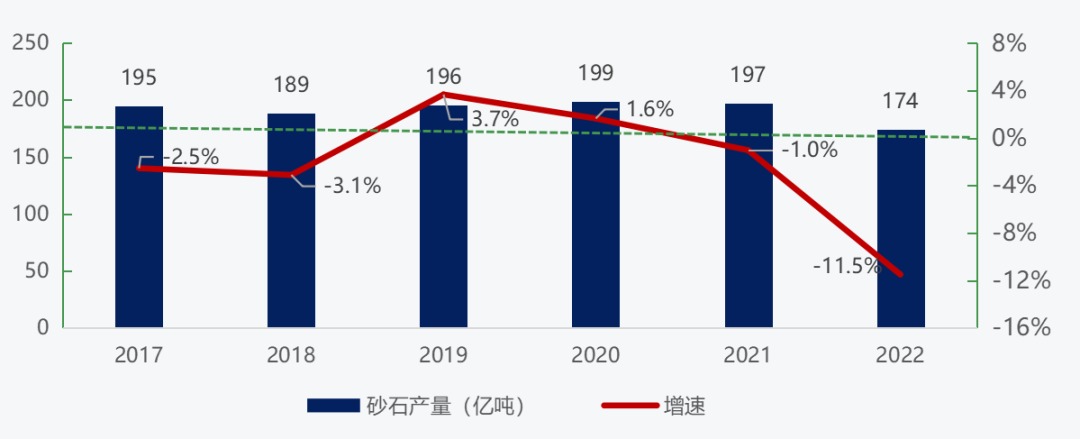 2022年砂石供需總體偏弱,供給端:產(chǎn)線開機率、產(chǎn)能利用率整體偏低;需求端:砂石需求收縮。從供需關(guān)系來看,2022年全年砂石處于供大于求的狀態(tài),企業(yè)庫存保持高位。全國砂石產(chǎn)量174.2億噸,較2021年下降11.5%。