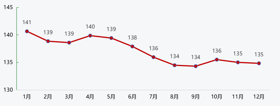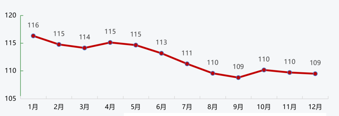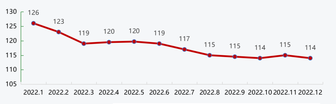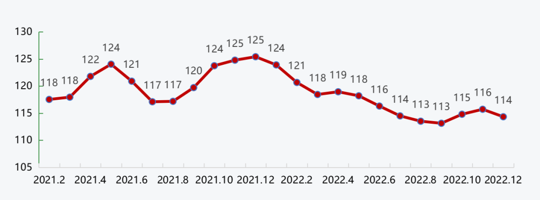 沿江城市砂石價格在年初高位運行的基礎(chǔ)上,受到疫情封港、下游需求不佳、沿江運費高企等因素的影響,價格持續(xù)回落,進(jìn)入四季度,隨著施工旺季的到來,需求回升,價格也隨著略有回升。整體來看,2022年沿江港口砂石價格持續(xù)回落,12月降至114元/噸,較年初下降3.4%。