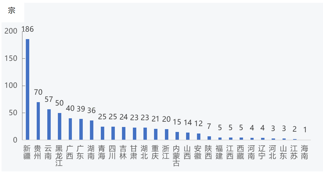 2022年,全國新設(shè)砂石礦權(quán)數(shù)量719宗,其中新疆新設(shè)砂石礦權(quán)數(shù)量最多,為186宗;貴州、云南、黑龍江新設(shè)砂石礦權(quán)數(shù)量為50~70宗;廣西、廣東、湖南新設(shè)砂石礦權(quán)數(shù)量為35~40宗;青海、四川、吉林、甘肅、湖北、重慶、浙江、內(nèi)蒙古、山西、安徽新設(shè)砂石礦權(quán)數(shù)量為10~25宗;陜西、福建、江西、西藏、河南、遼寧、河北、山東、江蘇、海南新設(shè)砂石礦權(quán)數(shù)量在10宗以內(nèi)。