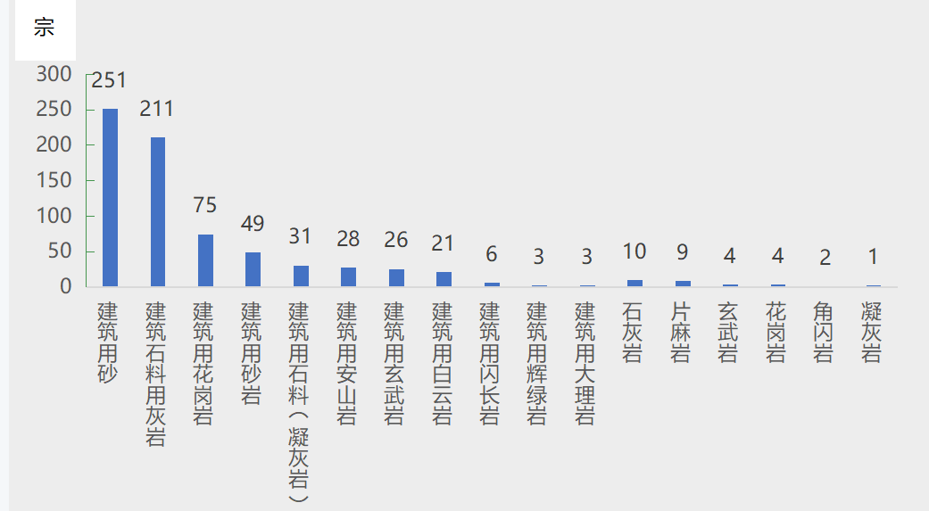 全國新設(shè)砂石礦權(quán)中,有建筑用砂、建筑石料用灰?guī)r、建筑用花崗巖、建筑用砂巖、建筑用石料(凝灰?guī)r)、建筑用安山巖、建筑用玄武巖、建筑用白云巖、石灰?guī)r、片麻巖、建筑用閃長巖、玄武巖、花崗巖、建筑用輝綠巖、建筑用大理巖、角閃巖、凝灰?guī)r17種礦種。其中建筑用砂、建筑石料用灰?guī)r兩類礦種新設(shè)數(shù)量最多,分別為251宗、211宗;建筑用花崗巖礦75宗;建筑用砂巖、建筑用石料(凝灰?guī)r)、建筑用安山巖、建筑用玄武巖、建筑用白云巖五類礦種新設(shè)數(shù)量在20~50宗;建筑用閃長巖、建筑用輝綠巖、建筑用大理巖三類礦種新設(shè)數(shù)量在10宗以內(nèi);另外,新設(shè)10宗石灰?guī)r礦、9宗片麻巖礦、4宗玄武巖礦、4宗花崗巖礦、2宗角閃巖礦、1宗凝灰?guī)r礦。
