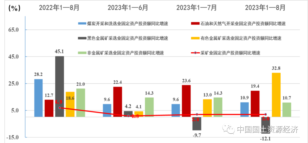 圖2 2023年1—8月我國采礦業(yè)及子行業(yè)固定資產(chǎn)投資累計同比增長情況