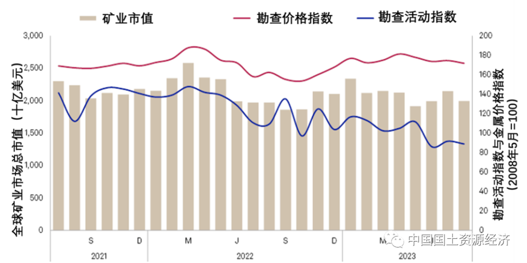 圖4 2021年7月—2023年8月全球礦業(yè)公司地質(zhì)勘查活動指數(shù)、勘查價格指數(shù)及公司總市值變化情況