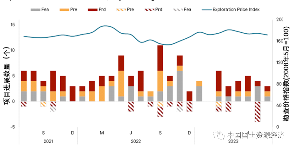 注:圖例中Fea為Feasibility,代表項目進入可行性研究階段;Pre為Preproduction,代表項目進入預生產(chǎn)階段;Prd指Production,代表項目進入生產(chǎn)階段。實心圖例代表積極項目進展,用正值表示;虛線圖例代表消極進展,用負值表示。EPI為勘查價格指數(shù)。