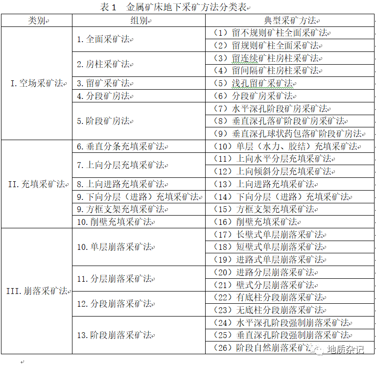 采礦方法的分類(lèi),是以回采時(shí)的地壓管理方法為依據(jù)的,因?yàn)榈貕汗芾?/span>方法是以礦石和圍巖的物理力學(xué)性質(zhì)為根據(jù),同時(shí)又與采礦方法的使用條件、結(jié)構(gòu)和參數(shù)、回采工藝等有密切關(guān)系,并且最終將影響到開(kāi)采的安全、效率和經(jīng)濟(jì)效果。因此,以此為依據(jù)可將采礦方法劃分為三大類(lèi)(表1)
