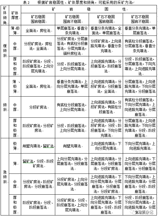 根據(jù)礦床地質(zhì)條件,按采礦技術(shù)要求,對(duì)礦體的傾角、厚度、礦石品位分布特征進(jìn)行統(tǒng)計(jì)分類(lèi),確定不同類(lèi)型的比重,分別選擇不同采礦方法方案(表2)
